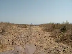 The dams were constructed of cyclopean masonry on a massive scale. The dam to the north is preserved, but the one immediately below the temple was knocked down by an exceptional Monsoon surge in the mid-eleventh century.[1] A myth about the Bhojpur dams has emerged thanks to the writing of William Kincaid.[2] He mis-interpreted an account in a Persian chronicle (recording that a dam was opened on the orders of Hoshang Shah of Malwa), as referring to Bhojpur, an idea elaborated by U. N. Day in 1965 and repeated in the subsequent years.[3] The account, translated by U. N. Day from Persian, states that the king pulled down a dam at the request of local merchants in Bhopal and Vidisha whose caravans were being raided by bandits who would take refuge at an inaccessible spot protected by the lake. This account refers to the Bhojtal at Bhopal where even today an island in the middle of the lake can be seen. The dam at Bhopal was subsequently repaired and further raised when the Kamlapati Palace was constructed in the eighteenth century.