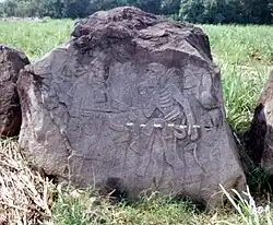 Monument 21 is a basalt boulder in a sugarcane field. The boulder has an artificially flattened upper surface bearing a bas-relief sculpture. The carved face has a 35° slope and measures 11 by 13 feet (3.4 by 4.0 m). The sculpture depicts three main figures. The central figure is the largest and faces towards a second figure seated on a throne. The third figure is behind the central figure, it is smaller and holds a hand puppet. The scene is filled out with twisting vines that sprout cocoa pods bearing human faces. Other details of the monument include birds, snakes and a butterfly with a human head. Monument 21 has been dated to the Classic period.[5] Monument 21 is located east of Mound 2, in the centre of Group B.[35] The decoration on the skirt of one of the figures may be the face of the central Mexican deity Xipe Totec.[13]