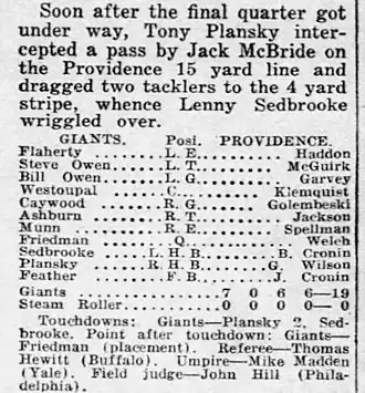 - ^ C.A. Lovett, "Giants Upset Providence: 22,000 Watch Steam Roller Stopped, 19–0," New York Daily News, Oct. 28, 1929, pp. 32–35.