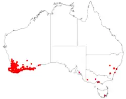 Australian bluebell was originally endemic to the south-west of Western Australia where it grew in coastal and mallee heath in the Avon Wheatbelt, Coolgardie, Esperance Plains, Jarrah Forest, Mallee, Swan Coastal Plain and Warren bioregions.[2] Horticultural use in other states, especially of the white and pink forms of the species, has allowed the species to be naturalised in other states, but the species does not appear to be as weedy as the similar B. heterophylla.[3]