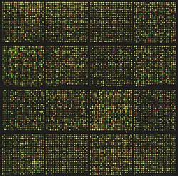 A microarray for approximately 8700 genes. The expression rates of these genes are compared using binary logarithms.