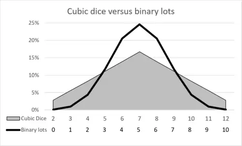 The graphical flattening can be deceptive: using 2 lots, the central (most common) outcome is 2 times as likely as the extreme outcome. But using 8 lots, the central (most common) outcome is 70 times more likely than the extreme outcome. Using cubic dice (or any dice with more than 2 faces) flattens this curve somewhat, making the odds more even, as shown below: