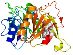 ![]() Crystallographic structure of the HsaC extradiol dioxygenase from M. tuberculosis (rainbow colored, N-terminus = blue, C-terminus = red) complexed with 3,4-DHSA (space-filling model (carbon = white, oxygen = red).[1] | |||||||||