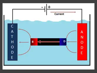 Current flowing in the BPE because it provides less resistive current path than the electrolyte. As illustrated in the Figure; as consequence of the current entering side (D/Blue) from the anode, side D will polarise cathodically (potential will become more negative). At the other hand, side (B/Red) where the current is leaving, it will polarise anodically (potential will become more positive) and will corrode. This is due to polarisation which occurs opposite to the current direction.[6]