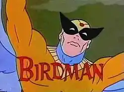 Birdman (voiced by Keith Andes) is an ordinary human who has been endowed by the sun god Ra with the ability to shoot solar rays from his fists and project quasi-solid "solar shields" to defend himself against attacks (Birdman's origin is only vaguely, and only briefly, hinted at during the series. His real name is there given as Raymond "Ray" Randall). After he had acquired his avian—and other—powers, he was recruited by a top-secret government agency, Inter-Nation Security, and now works full-time fighting crime, assisted by his pet eagle, who responds to the name of Avenger. In addition to the abilities he received from Ra, Birdman also possesses the power of flight, thanks to the giant wings which sprout from his back. It is possible Birdman is fireproof; being forced into an incinerator recharged rather than hurt him. His sole weakness is that he has to recharge his superhuman powers periodically, through exposure either to the sun's rays or to a comparable source of heat and/or light such as a desk lamp (when he was once shrunken to insect proportions) or the aforementioned incinerator, a weakness that is exposed in nearly every episode. His trademark is his battle cry of "Biiiiirdman!!!" whenever he goes into battle.