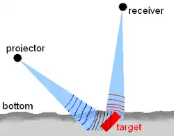 To detect a buried object, the transmit ping must penetrate into the bottom. That requires a powerful and highly directional projector. Next, a directional receiver should be placed at the point where the “target + surrounding bottom” reflection is the best. This is a bistatic system. The example is SITAR project,[5] developed to find objects like toxic waste containers and mines.