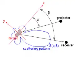 Targets do not reflect the sound omni-directionally. The mechanism of sound reflection (or scattering by the target) is complicated, because the target is not just a rigid sphere. Scattered sound level depends on the angle β from which the target is ensonified by the projector, and it also varies with angle scattering direction α (refer to local target axes Z{x,y}). These angles are often referred to as aspects. This scattered sound level vs (α, β) function is called the scattering pattern S(α, β). Direction of maximum echo (maximum of S(α, β)) also depends on target shape and inner structure. So sometimes the best ensonifying aspect is not the same as the best receive aspect.