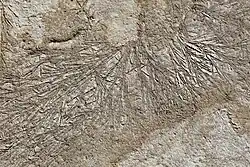 The Kirtland Formation was deposited shortly after the Fruitland Formation, and consists of thick greenish shales and siltstones, with just a few thin coal beds and white sandstone beds. The lower part of this formation is called the Hunter Wash Member and is bounded by a white sandstone bed at its base and a distinctive brown sandstone bed (the Bisti Bed) at its top. Between is drab green siltstone. The middle part of this formation is called the Farmington Sandstone which consists of brown-topped sheets of sandstone. The upper part of the formation is called the De-na-zin Member and is similar to the Hunter Wash Member, but with purple beds near its top.[8] The sandstone of the Farmington Member reflects a time of uplift somewhere nearby, producing high ground from which coarse sediments were eroded. Dinosaurs and other fossils are found scattered throughout the Kirtland Formation.[7] Some 200 species of plant or animal fossils have been identified in the combined Fruitland and Kirland Formations, most of which are found in the Bisti/De-Na-zin Wilderness. The plant fossils include petrified logs, leaf impressions, and carbonized leaves.[8]