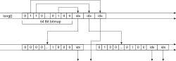 In this example implementation for a bitwise trie with bitmap, nodes are placed in an array of long (64-bit) integers. A node is identified by the position (index) in that array. The index of the root node marks the root of the trie.