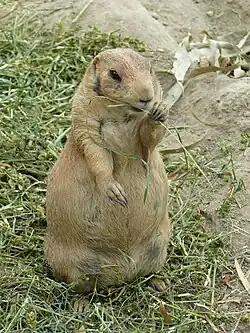 The black-tailed prairie dog (Cynomys ludovicianus) is a rodent of the family Sciuridae (the squirrels) found in the Great Plains of North America from about the United States–Canada border to the United States–Mexico border.[3] Unlike some other prairie dogs, these animals do not truly hibernate. The black-tailed prairie dog can be seen above ground in midwinter. A black-tailed prairie dog town in Texas was reported to cover 25,000 sq mi (64,000 km2) and included 400,000,000 individuals.[4] Prior to habitat destruction, the species may have been the most abundant prairie dog in central North America. It was one of two prairie dogs described by the Lewis and Clark Expedition in the journals and diaries of their expedition.