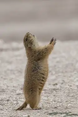 Perhaps the most conspicuous prairie dog communication is the territorial call or "jump-yip" display. A prairie dog will stretch the length of its body vertically and throw its forefeet into the air while making a call.[38] A jump-yip from one prairie dog causes others nearby to do the same.[39] The instigator of the jump-yip 'wave' uses the jump-yip to assess the vigilance or watchfulness of others in the colony - a longer jump-yip wave indicates watchful neighbors and leads to increased foraging by the instigator.[40]