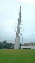 An example of a larger work is the tapering steel column designed by Eillis O’Connel called "Tower of Light". It "is a futuristic design which comprises a spectacular tower of stainless steel mesh, interwoven with fibre optic cables that light at night and a translucent blue resin casting at the apex."[1]