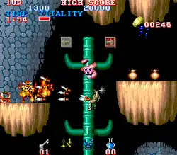 The game is presented in a side-scrolling format, with eight-way scrolling (like Bionic Commando).[2] The player controls the barbarian hero to navigate through eight levels infested with enemies and destroying the levels bosses. The player can find a number of "wise men" who give rewards when rescued. Though the wise man rewards often consist of self-evident "advice", most come in the form of "Zenny coins", currency that allows the player to buy various items, such as an upgrade to their weapons and armour, keys for treasure chests, and anti-poisoning potions. Hidden special items that reveal coins, grant upgraded armour, full vitality, extra lives, extra time, or simply bonus points may be found by attacking certain walls. The player's vitality bar will also increase up to four times as a reward for reaching score benchmarks. The player can also find hidden dungeons in the level for extra points and items.