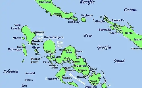 Blackett Strait is a waterway in the Western Province of the Solomon Islands. It lies between the islands of Kolombangara to the north, and Arundel Island (Kohinggo) to the south. It connects Vella Gulf to the west with Kula Gulf to the east. It is almost certainly named after Lt. Frederick Arthur Blackett (1846-1880), the youngest son of Sir Edward Blackett 6th Bt., who served on HMS Thalia as part of the China Station from 1872 to 1873.[1]