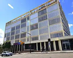 The foundation stone for the Civic Centre was laid by Premier of NSW, Bob Heffron, on 17 June 1961, on the same occasion marking the change of Blacktown from a Shire to a Municipality.[19][20] The Civic Centre was officially opened on 25 October 1965 by the Minister for Local Government and Highways, Pat Morton, with the mayor, Alfred Ashley-Brown, declaring "It is my sincere wish we will as a council cherish the heritage which brings us here tonight – that this chamber will be a place wherein good government within our sphere of responsibility will be made manifest, and that all decisions which are made shall be for the good of the people of the Municipality of Blacktown".[21] On 10 April 1967, the old 1939 Council Chambers were transformed into the first Blacktown Municipal Library, which was later demolished and became the Max Webber Library from 1980.[22]