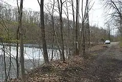 From there, the old right-of-way can no longer be followed, as it continues only a short distance, and then dead ends on private property. After that, the right-of-way has been mostly obliterated by the widening of U.S. Route 46, traveling along the eastern shore of the Delaware River until the town of Delaware is reached. In Delaware, until 2012, a remaining vestige of the BRW was a short, deep cut high into the steep rock wall on the southern outskirts of town along US Route 46. The western wall of the cut was removed that year to provide a parking lot for Gary Gray Trucking. The rather odd position of the cut is explained by Blair's apparent desire to have his railroad end at, rather than across the tracks from, Delaware Station. Another vestige is the partially filled turntable pit of the BRW, located alongside Delaware Road, just northeast of the village. The Lackawanna Railroad's railroad station in Delaware was torn down in 1968 and the tracks of the old Warren Railroad were removed from the location in 1970.