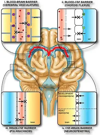 1. ^ a b c d e Daneman R, Prat A (January 2015). "The blood-brain barrier". Cold Spring Harbor Perspectives in Biology. 7 (1): a020412. doi:10.1101/cshperspect.a020412. PMC 4292164. PMID 25561720.