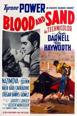 Blood and Sand is a 1941 American Technicolor film drama starring Tyrone Power, Linda Darnell, Rita Hayworth and Nazimova. Directed by Rouben Mamoulian, it was produced by 20th Century Fox and was based on the 1908 Spanish novel Blood and Sand (Sangre y arena) by Vicente Blasco Ibáñez.[2] The supporting cast features Anthony Quinn, Lynn Bari, Laird Cregar, J. Carrol Naish, John Carradine and George Reeves. Rita Hayworth's singing voice was dubbed by Gracilla Pirraga.[3][4]