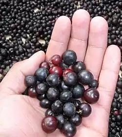 The fruit is a berry 5–16 mm (31658 in) in diameter with a flared crown at the end; they are pale greenish at first, then reddish-purple, and finally uniformly blue when ripe.[5] They are covered in a protective coating of powdery epicuticular wax, colloquially known as the "bloom".[3] They generally have a sweet taste when mature, with variable acidity.[3][5] Blueberry bushes typically bear fruit in the middle of the growing season: fruiting times are affected by local conditions, such as climate, altitude, and latitude, so the time of harvest in the northern hemisphere can vary from May to August.[3][5]