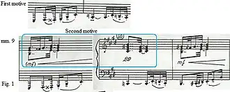 The movement starts with the first motive in the left hand, accompanied by seventh chords in the right hand. At measure 9, the second motive is presented in the right hand while the first motive continues in the left hand. There are several technical demands that need to be addressed. Due to the thick chords, they may be played as rolled chords or alternative finger number such as using a thumb to cover the bottom white key and the black key. Many chromatic scale-like runs and jump-bass accompaniment patterns in the left hand make this piece tricky to master. The pianist should practice slowly so as to avoid stumbling and only gradually increasing tempo.