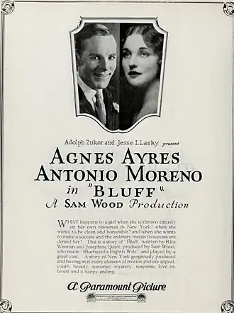 Bluff is a 1924 American silent drama film directed by Sam Wood and written by Willis Goldbeck, Josephine Quirk, and Rita Weiman. The film stars Agnes Ayres, Antonio Moreno, Fred J. Butler, Clarence Burton, Pauline Paquette, and Jack Gardner. The film was released on May 12, 1924, by Paramount Pictures.[1][2]