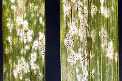 Powdery mildew of wheat is relatively easy to diagnose[8] due to the characteristic little white spots of cotton-like mycelia.[9] These can appear on the upper and lower epidermis of the leaves. As the disease progresses they become a light tan color.[9] B. g. f. sp. tritici is an obligate parasite which means it only grows on living tissue. Though present throughout wheat growing regions, it especially favors the eastern seaboard of the United States as well as coastal regions of the United Kingdom.