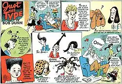 Dunn began his career at King Features. He submitted gags to newspapers and magazines and sold skits to Earl Carroll for his Vanities on Broadway in 1930โ31. In 1936, "he invented the knock-knock joke"[1] in Knock Knock: Featuring Enoch Knox, a book he wrote that sold over two million copies. More successful books followed including I'm Gonna Be a Father, Hospital Happy, One Day in the Army and Magic for All. During World War II, he contributed to the war effort, as noted in the September 19, 1942 issue of Editor & Publisher, "Another cartoonist doing his bit is Press Alliance artist Bob Dunn, whose Brassband Bixby enlisted in the armed forces shortly after December 7. The hero is in Navy Intelligence. Dunn has made many personal appearances at Army camps and U.S.O. centers making caricatures of the officers and men as well as entertaining them with his amateur magician and card tricks."[2] Following the war, King Features syndicated Dunn's Just the Type from May 5, 1946 to November 24, 1963. It ran in the New York Journal-American and several other newspapers. Comics historian Allan Holtz commented, "Never a syndication success, King Features may well have let him do the feature just to keep him happy while working on the Hatlo cash cow feature... When Hatlo died in 1963, though, Dunn's workload presumably got that much heavier and Just the Type was dropped. Dunn finally got an official byline on They'll Do It Every Time starting in 1966."[3]