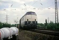 Until 1978, the Deutsche Bundesbahn passenger service ran from Bochum-Langendreer via Bochum-Nord, Bochum-Riemke to Wanne-Eickel (see Bochum-Riemke–Wanne-Eickel line below). After the construction of a connecting curve from Bochum Central Station (Hauptbahnhof) to the line towards Riemke in 1979,[2] passenger services ran until 1990 from Bochum over the curve from Herne-Rottbruch to Herne,[3] but subsequently services ran via Wanne-Eickel to Gelsenkirchen Central Station.[4] Herne Rottbruch station represented a special case for operations, because it is located on a bridge over autobahn 43, but it has not been served since 1990.[5] In the early 90s, the electronics manufacturer Nokia, which then had a factory near the railway, sponsored the modernisation of the fleet (starting with three vehicles of class 515 battery electric multiple units and followed by class 628 diesel multiple units). As a result, the line was renamed the Nokia-Bahn ("Nokia Railway") and Bochum-Graetz station was renamed Bochum-Nokia. Following Nokia's closure of its Bochum factory in late 2008, the line was renamed the Glückauf-Bahn. At the timetable change of 2009/10, the station was renamed Bochum-Riemke.[6]