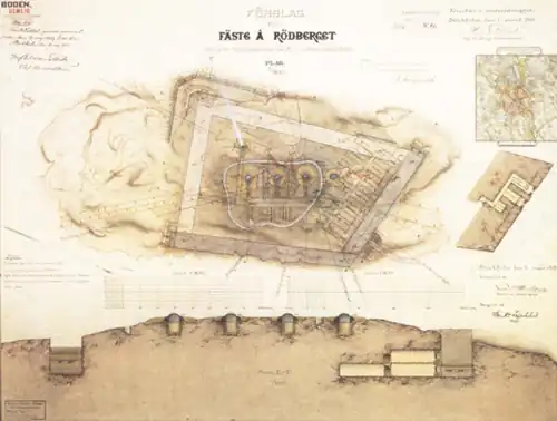 The following year, in 1891, Rappe wrote a memorandum that explained in more detail the budget, which suddenly had risen to 4.5 million kronor, and would finance the construction of two strongholds at Paglaberget and Åberget with a total of six long cannon, ten howitzers and eight quick-firing cannon, all in armoured turrets, along with machine guns and bunkers, barracks and supply depots. The plan included a reserve battalion of 1,000 men, an artillery battalion of 600 men, an engineer company of 120 men, and supply and depot personnel.[32] Axel Rappe's large study on the permanent fortifications of Sweden—a mandate given to him in 1882—was published in 1892 and cemented the view that a central fortress was needed in Boden to support and supply troops gathering between the Lule River and the eastern border, alongside the strengthening of the coastal defences at Stockholm, Gothenburg and Karlskrona.[29][33]