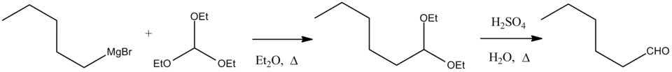 Reaction of a Grignard reagent with triethyl orthoformate gives an acetal, which can be hydrolyzed to an aldehyde. For example, the synthesis of n-hexanal:[1]