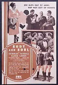 Body and Soul (1931) is an American Pre-Code action drama film directed by Alfred Santell and starring Charles Farrell, Elissa Landi, Humphrey Bogart, and Myrna Loy.[1] The story, adapted from the stage play Squadrons by Elliott White Springs and A.E. Thomas, depicts Royal Air Force pilots in World War I.[Note 1]