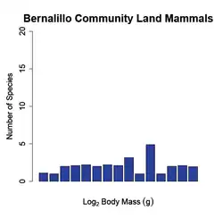 The body size-species richness pattern (see fig. 1) has been documented for land mammals across numerous continents such as North America, South America, Eurasia and Africa (Brown and Maurer, 1989;[5] Bakker and Kelt, 2000;[6] Maurer et al. 1992[7]). Traditionally the pattern has been explored by plotting the number of species on the y-axis and the logarithm to the base two of the species body mass (g) on the x-axis. This yields a highly right skewed body size distribution with a mode centered near species with a mass ranging from 50-100 grams. Although this relationship is very distinct at large spatial scales, the pattern breaks down when the sampling area is small (Hutchinson and MacArthur, 1959;[1] Brown and Maurer 1989;[5] Brown and Nicoletto 1991;[3] Bakker and Kelt 2000[6]).
