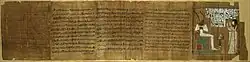 The Art Institute of Chicago contains a Book of the Dead scroll, an Ancient Egyptian papyrus depicting funerary spells.[1] This scroll of funerary spells serves as a protection from "Second Death". In ancient Egyptian spiritual practice, the term "Second Death" refers to the phenomenon of the body permanently separating from the soul.[2] The Book of the Dead scroll is made of papyrus, a material made of reed plants cultivated on marshy plantations, which is then cut into strips and left to dry in horizontal and vertical rows. The scroll also contains pigments used to inscribe the funerary spells.[3]
