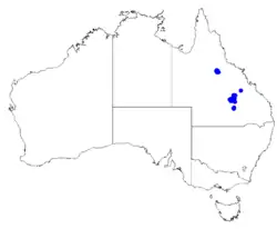This boronia grows in woodland and forest on sandstone in the Carnarvon Range and White Mountains National Park.[2]