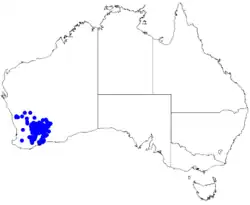 This boronia grows on undulating plains, hills, stony cliffs and breakaways in the Avon Wheatbelt, Coolgardie and Mallee biogeographic regions of Western Australia.[12]