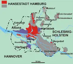 In 1871 at the declaration of the German Reich the State of Hamburg consisted of the city of Hamburg with Altstadt (Old city), Neustadt (New city) and St. Georg (Hamburg since 1868). A suburb called St. Pauli and several directly named outskirts and the other land.