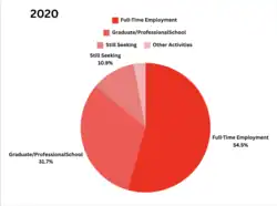 For the 2020 first destination activity, 55% of the graduates were employed full-time, a higher percentage of 32% pursued further education in graduate or professional programs, 11% were still seeking employment, and 3% were involved in other activities, which included part-time work, military service, or taking time off.