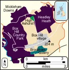 The village of Box Hill is to the east of the summit and to the west of the Country Park owned by the National Trust. The earliest flint cottages date from the 1800s, although much of the village was constructed in the first half of the 20th century.[11] By 2005 there were more than 800 dwellings, of which over five hundred were mobile homes. An estimated 41% of the community is aged 60 or over.[12] St Andrew's Church, part of the ecclesiastical parish of Headley, was consecrated in 1969 and the village hall opened in 1974.[13][14] The village is not part of a civil parish.