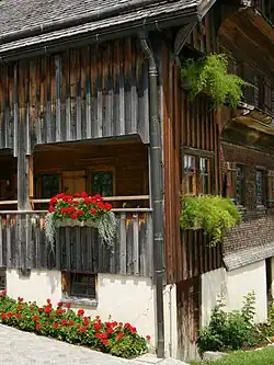 The special feature of the residential wing is the Schopf, a veranda-like porch with folding shutters, which extends over the entire sunny eaves side of the residential wing. On the side facing away from the sun, the Schopf is found in a closed design and is thus integrated into the building as a Kammer ("chamber") or Stüble ("lounge"). In the warm season, the Schopf serves as a dining and lounge area, as a sheltered place for ornamental and useful plants and as a utility room. In winter, the Schopf with the shutters down made a significant contribution to improving the thermal balance of the Bregenzerwälderhaus.[3][4]
