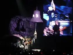 Johnson hangs on to a bell while performing the song "Hells Bells"