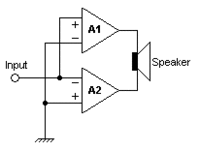 Example: The image shows two identical amplifiers A1 and A2 connected in bridge mode. The system is arranged in such a way that the outputs from the amplifiers are inverted with respect to each other. In other words, as the signal in one amplifier is swinging positively, the signal in the other is swinging negatively. When the output of one amplifier is at +10 volts the output of the other will be at −10 volts, and vice versa. The load is connected between the "hot" (often red) outputs of the two amplifiers, and is subject to the potential difference between them. If the instantaneous potential at the output of one amplifier is at +10 volts, then the output of the other one will be at −10 volts, and the potential difference across the load will be 20 volts, or double the potential available from a single amplifier.