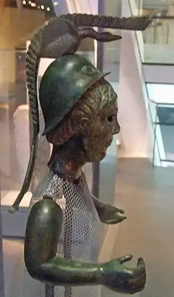 At Birrens (the Roman Blatobulgium), archaeologists have found a Roman-era stone bas-relief of a female figure;[16] she is crowned like a tutelary deity, has a Gorgon's head on her breast, and holds a spear and a globe of victory like the Roman goddesses Victoria and Minerva.[17] The inscription mentioned above assures the identification of the statue as Brigantia rather than Minerva. A statue found in Brittany also seems to depict Brigantia with the attributes of Minerva.