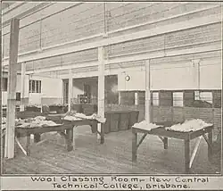 Opened in 1915 to accommodate classes for wool-classing, building construction and botany this two-storey building has a tough and distinctive industrial character. With the dedication of purpose-built classing facilities for the training of wool classers, the building demonstrates the importance of the wool industry in Queensland. The form and fabric of the building are substantially intact. During the mid-1990s alterations have been made to some of the internal spaces. The large wool classing room to the first floor is now partitioned into smaller studios and teaching spaces. The partitioning screens, with clear perspex to the upper portions, allow the filtered light from the saw toothed roofs to penetrate the space.[1]