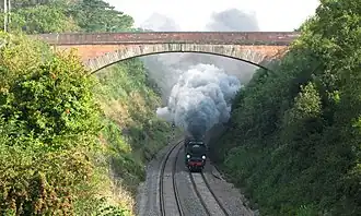 After passing over Victory Crossing at Bradford-on-Tone, the line starts to climb upwards. It passes through the remains of Wellington station and then under the A38 road at Beambridge, which was the site of the line's terminus while work was underway to excavate the Whiteball Tunnel at the top of Wellington Bank.[11] It was coming down here that City of Truro became the first locomotive to exceed 100 miles per hour (160 km/h).[12]
