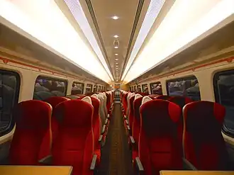 ![]() The interior of Standard Class aboard a Virgin Trains East Coast refurbished Mark 4 TSO vehicle | |