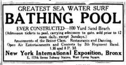 The fair's initial intention was to "attract foreign trade to this country after the war."[6] Organizers had received applications from numerous countries to host exhibits at the fair.[17] The organizers also planned for dozens of buildings to eventually be erected at the fair; estimates ranged from 70 to more than 100.[6][11][16] The swimming pool at the Bronx World's Fair was marketed as the world's largest saltwater pool, measuring 300 by 350 feet (91 by 107 m) with a capacity of 2,500,000 U.S. gallons (9,500,000 L), and ranging from 0 to 10 feet (0.0 to 3.0 m) deep. The pool contained diving boards and a wave pool machine at the deep end, as well as a 50-by-55-foot (15 by 17 m) beach with sand brought from Rockaway, Queens.[18][16] The fair also contained a scenic ridable miniature railway on the Bronx River, a "mountain" exhibit with a 65-foot-tall (20 m) waterfall, and a hotel nearby.[19] LaMarcus Adna Thompson built a roller coaster at the site, while the Eli Bridge Company's Ferris wheel from the Panama–California Exposition was brought over to the Bronx World's Fair.[16] Other attractions included a bathing pavilion that could fit 4,500 people; a convention center; and 15 large pavilions, including Chinese and North Sea-themed pavilions, as well as those for fine arts, liberal arts, and American achievements.[11][16]