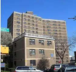 As of 2008, there were a total of 28,298 housing units in Brownsville.[43] Brownsville is dominated by public housing developments of various types, mostly in a small area bounded by Powell Street and Rockaway, Livonia, and Sutter Avenues that is composed of multiple inward-facing developments located on six superblocks.[34] The neighborhood contains the most densely concentrated area of public housing in the United States.[44][48] NYCHA owns more housing units in Brownsville than in any other neighborhood, with about one-third of the housing stock (around 10,000 units) in its 18 Brownsville developments, comprising over 100 buildings within 1 square mile (2.6 km2).[49][16]: 108 In 2013, it was estimated that the housing developments alone contained nearly 21,000 people.[19] Many of these buildings were built in the mid-20th-century and are deteriorating as of 2015.[41]: 8 (PDF p. 5) Some of these NYCHA developments are in the process of being converted into RAD PACT Section 8 Developments, where, as part of a public-private partnership with NYCHA, private developers would take over the developments and provide funding for capital improvements.[50] These conversions include Howard Avenue Houses, Seth Low Houses, Sutter Avenue-Union Houses, Tapscott Street Rehab Houses, Ralph Avenue Houses, 104-14 Tapscott Street Houses, and Lenox Road-Rockaway Parkway Houses.[51]