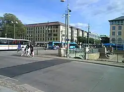 Brunnsparken is dominated by tram stops, surrounding the square from three directions. Together with Drottningstorget right to the east, Brunnsparken functions as an important hub for the tram network, with almost every line passing through it. Together with the Gothenburg Central Station and the Nils Ericson Terminal, it forms the centre of all public transport in Gothenburg.