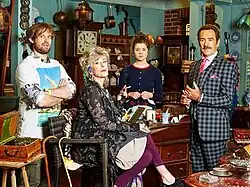 Promotional image released in anticipation of the series' broadcast, from left to right: Naz Osmanoglu (Toby), Maureen Lipman (Beverley Bull), Claudia Jessie (Faye), and Robert Lindsay (Rupert Bull)
