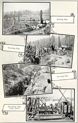 In 1886, the Portland Water Committee, predecessor of the Portland Water Bureau, began a search for a superior drinking water source. The committee, led by Henry Failing, commissioned Isaac W. Smith, an engineer and surveyor, to inspect any viable water supply in the region. Smith chose the Bull Run River, and a five-month survey trip led him to conclude that a gravity-flow system could deliver clean water from Bull Run to Portland.[23] In 1892, U.S. President Benjamin Harrison signed a proclamation creating a protected area, the Bull Run Reserve, in the watershed. By 1895 Portland had built a diversion dam on the Bull Run River, and completed its first conduit (Conduit 1) to carry Bull Run water to the city.[24] At about the same time as the Smith survey, a small farming community, at first named Unavilla but renamed Bull Run in 1895, grew up near the confluence of the Bull Run and Sandy rivers.[22] Meanwhile, improvements to the Barlow Road encouraged population growth along the lower Sandy and the establishment of cities like Gresham and Sandy. Even so, by 1900 much of the upper Sandy basin was still remote, wild, and accessible mainly by trails.[22]